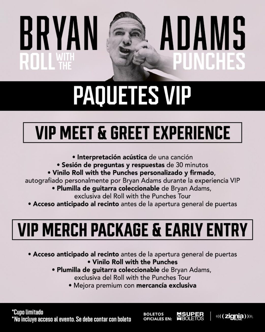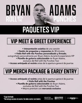 Tu noche de concierto no será lo mismo al adquirir tu paquete de Experiencia VIP, donde podrás vivir momentos inolvidables junto al cantante, desde una sesión acústica hasta recibir diferente mercancía oficial y exclusiva de Bryan Adams y “Roll With The Punches”, solo para fans.